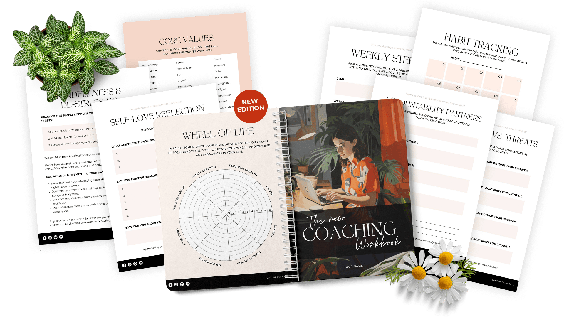 Get Instant access now to all of the 53 beautifully designed pre-written online coaching pages which include goals setting worksheets, vision worksheets, habit tracking, wheel of life worksheets, beautiful cover options, welcome pages, checklists, call to action pages, and so much more…