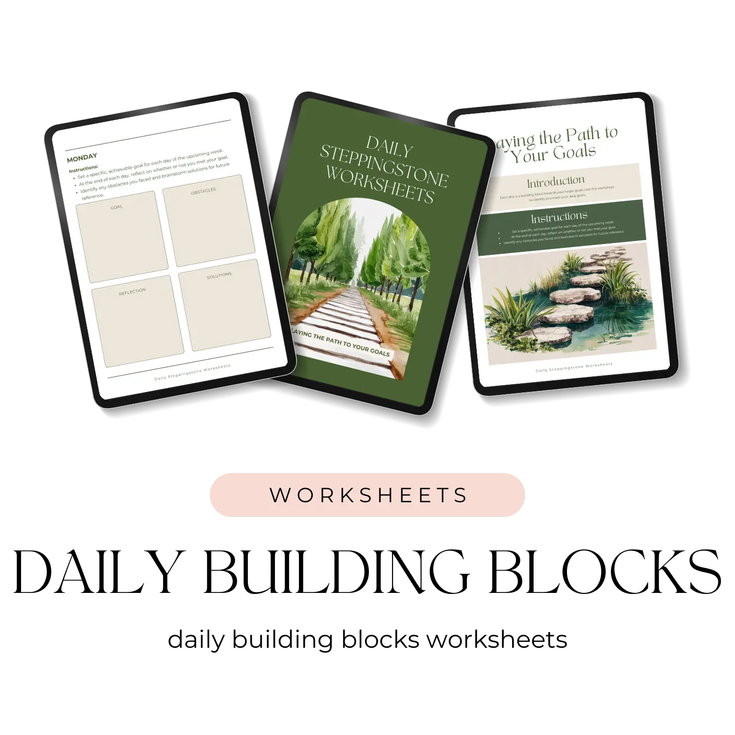 • Daily Steppingstone Worksheets: Empower your clients to break down their big goals into manageable steps with these practical worksheets. Develop a clear roadmap to success by focusing on the daily building blocks that propel them forward.
