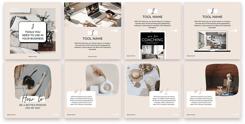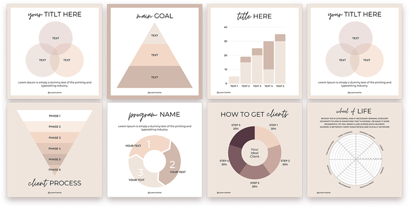 What can I use this templates to create? When you use your template, you will be able to create beautiful social media posts, highlights, stories, Instagram carousels, and more, for you & your clients. They are also the perfect way to promote your workshops, events, and courses and even allow you to charge premium prices for your programs and services!